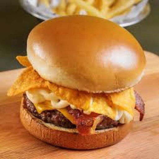 Pão brioche, carne 150g, queijo cheddar, alface, tomate, cebola caramelizada, Doritos.
